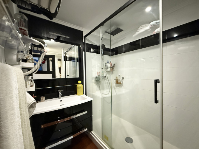 La pièce de vie lumineuse s’ouvre sur une terrasse ensoleillée, véritable prolongement de l’intérieur, idéale pour contempler le port et profiter de l’animation du quai. Le coin nuit séparé préserve l’intimité, tandis que la salle d’eau, contemporaine et fonctionnelle, complète harmonieusement l’ensemble.