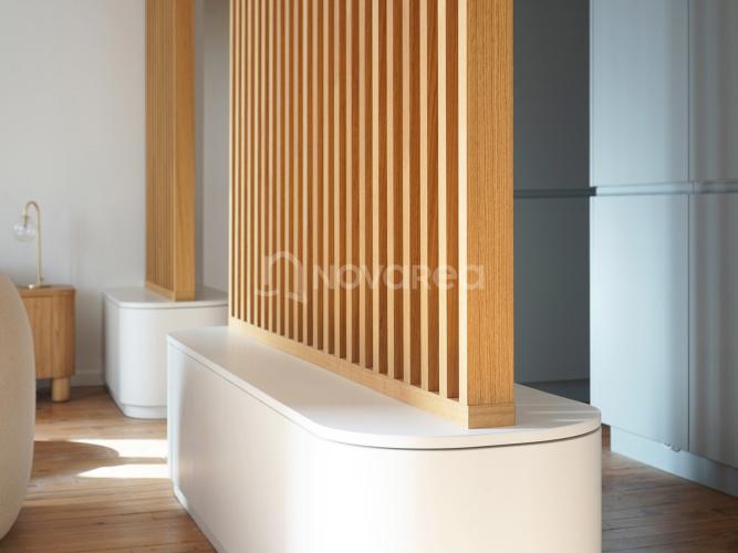 La rénovation a été pensée dans les moindres détails avec des matériaux de grande qualité. L’appartement bénéficie d’un chauffage réversible en climatisation installé en gainable, une solution à la fois esthétique et particulièrement confortable lors des fortes chaleurs estivales. Les menuiseries en double vitrage viennent compléter les prestations pour assurer un confort optimal au quotidien.