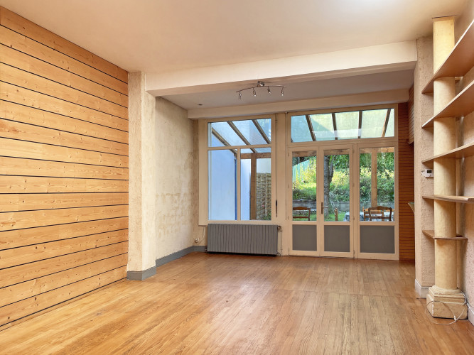La pièce de vie, baignée de lumière naturelle, est pensée comme un lieu de partage. Sa cuisine semi-ouverte facilite les moments conviviaux. Depuis le séjour, la perspective est unique : un jardin arboré de 200 m², une terrasse intime à l’abri des regards… un véritable luxe citadin, à savourer été comme hiver.