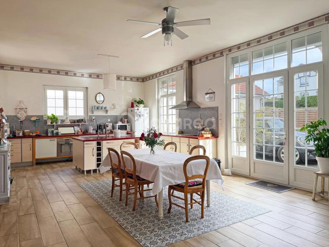Dès l’entrée, les volumes impressionnent. La pièce de vie de plus de 200 m² s’articule autour de différents espaces : salon avec poêle à bois, coin piano, espace créatif… Un lieu pensé pour vivre, recevoir et imaginer. Sur la gauche, une cuisine indépendante de 50 m² séduit par sa luminosité et ses proportions généreuses.