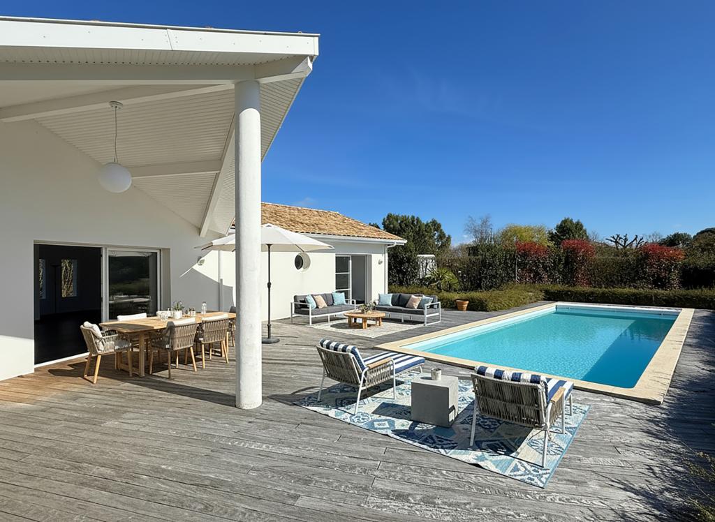 Située au cœur d’un environnement recherché à Angresse, dans un chemin au calme, cette maison contemporaine de plain-pied de 156 m² offre un cadre de vie privilégié, à proximité immédiate des commerces et à quelques minutes d’Hossegor à vélo grâce à une piste cyclable sécurisée.