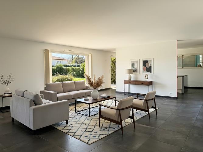 La maison s’organise autour d’une spacieuse pièce de vie baignée de lumière, ouverte sur deux terrasses et la piscine. La cuisine fonctionnelle est complétée par une arrière-cuisine, idéale pour faciliter l’organisation du quotidien.