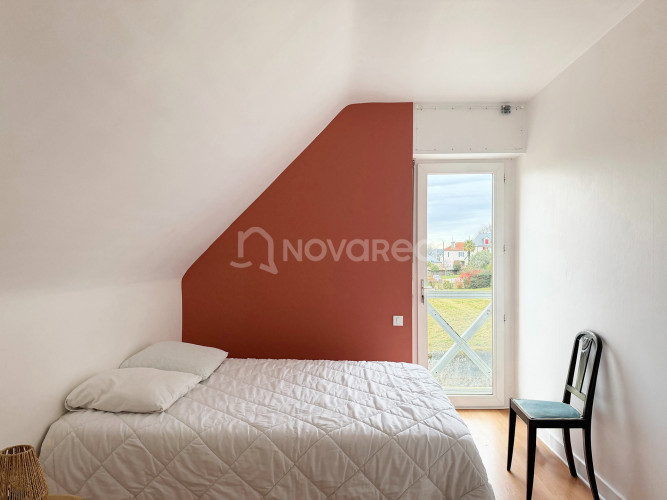 L’étage accueille un palier distribuant deux chambres harmonieusement séparées par une salle d’eau, un WC indépendant, ainsi qu’une suite parentale aux volumes généreux avec salle de bains, véritable refuge privé.