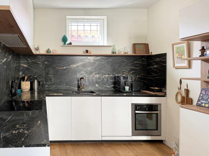 Le rez-de-chaussée accueille une entrée, un salon lumineux ainsi qu’une vaste cuisine équipée avec espace salle à manger. L’ensemble forme un espace de vie convivial et tourné vers l’extérieur, idéal pour recevoir ou simplement profiter d’un moment de calme en plein centre-ville.