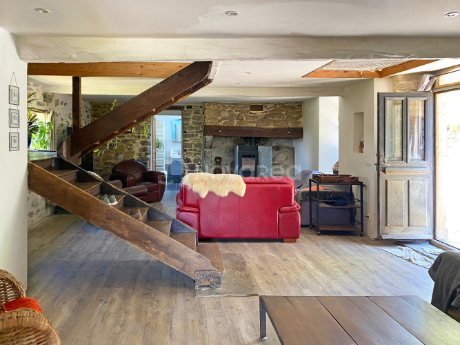 Dès l’entrée, la pièce de vie s’articule autour d’un poêle mixte, créant une atmosphère conviviale. D’un côté, une grande cuisine ouverte sur le jardin, équipée d’un poêle à bois, invite à partager de beaux moments en famille. De l’autre, une salle d’eau complète l’espace avec baignoire, douche et WC.
