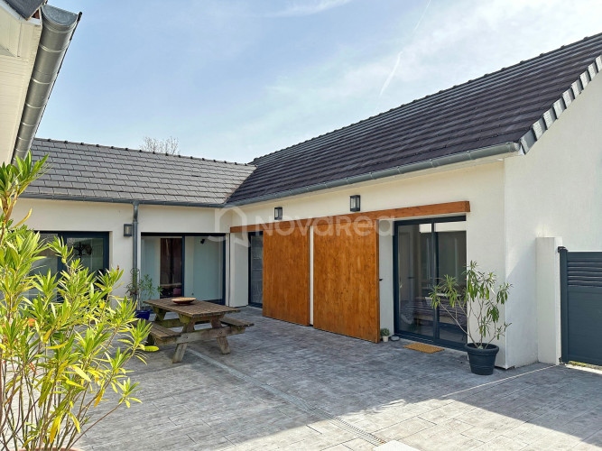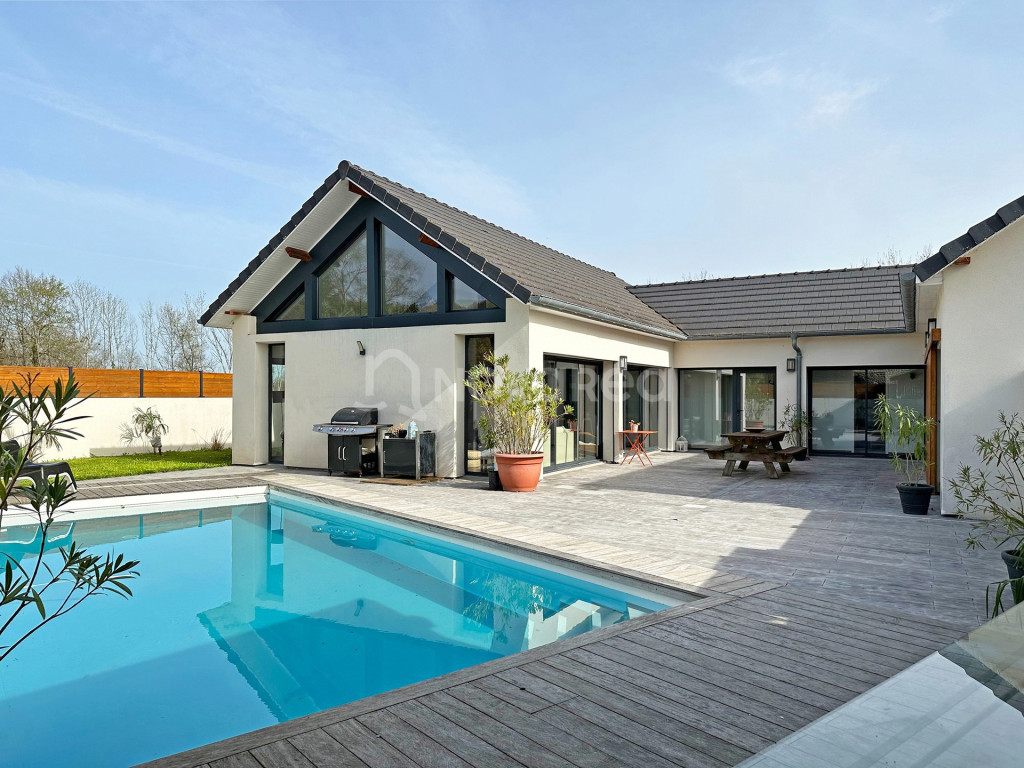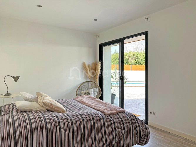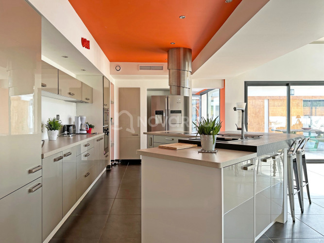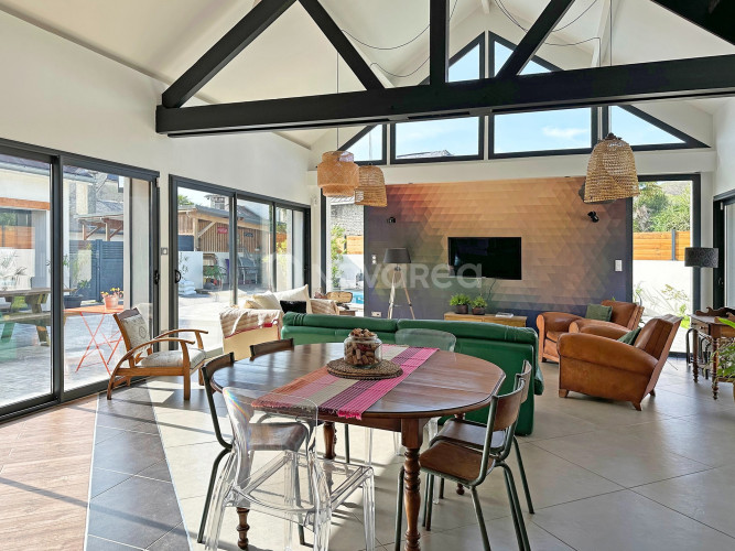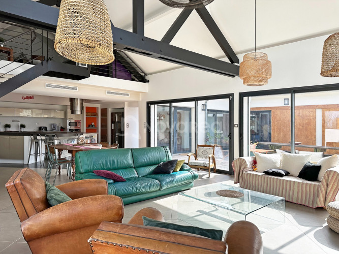 Cette villa de 2013 avec piscine et patio offre une ambiance californienne à l’écart du tumulte de la ville. On parie que vous allez craquer pour son séjour cathédrale avec poutres apparentes et grandes baies vitrées coulissantes. La cuisine est spacieuse et bien équipée, et profite de deux pièces complémentaires pour être sûr de bien recevoir : garde-manger cellier et buanderie. L'escalier métallique mène à une grande mezzanine, à la fois bureau, chambre d'appoint ou salle de jeux pour les enfants.