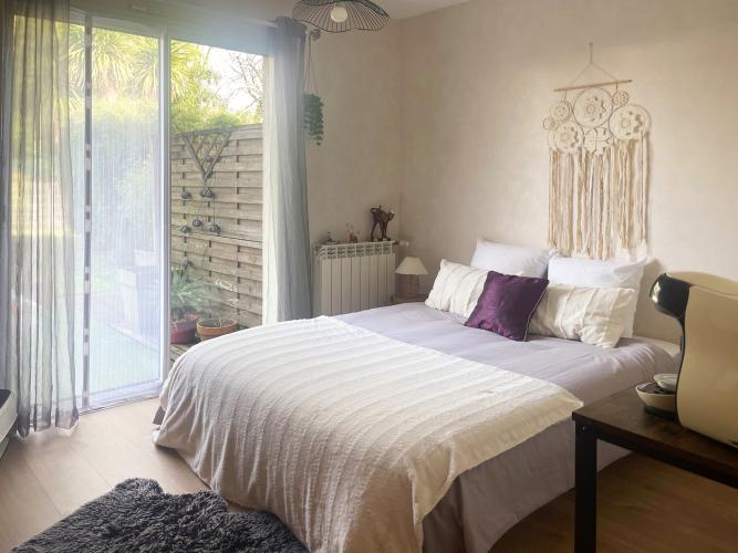 Au rez-de-chaussée, une chambre avec sa salle d'eau attenante donne également sur le jardin arrière.