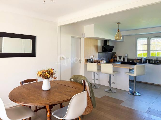 La maison s’organise autour d’une belle pièce de vie avec séjour et salle à manger, réchauffée par un poêle à bois. La cuisine ouverte, fonctionnelle et conviviale, prolonge naturellement cet espace. Le rez-de-chaussée accueille également un bureau ainsi qu’une suite parentale.