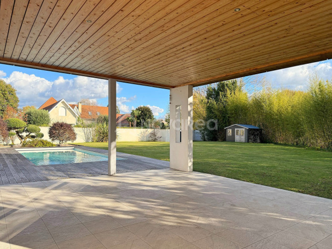 Les larges ouvertures de la cuisine et du séjour prolongent naturellement le quotidien vers les terrasses et le jardin. La piscine, idéalement implantée, devient le centre des moments de détente et de partage.