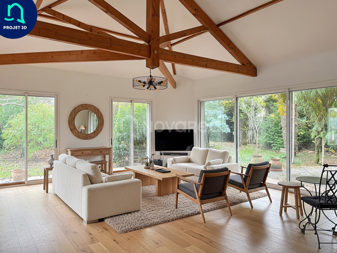 Le rez-de-chaussée accueille un large séjour salle à manger sublimé par ses baies vitrées ouvrant sur la terrasse, ainsi qu’une cuisine séparée et fonctionnelle. Un ancien cabinet médical, déjà aménagé et doté d’une salle d’eau, peut facilement devenir une suite parentale hyper confortable… ou permettre de poursuivre une activité libérale en toute indépendance. À l’étage, trois chambres complètent la partie nuit, accompagnées d’une grande buanderie pratique pour organiser le quotidien.