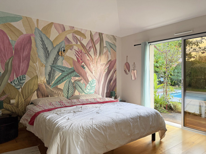 À l’extérieur, place à la détente : une belle terrasse ombragée accueille l’espace repas, un coin salon de jardin invite à profiter des longues soirées d’été, tandis que la piscine et les espaces verts complètent ce cadre de vie familial et paisible.
